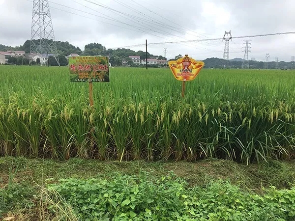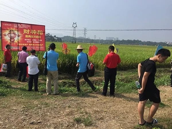 上午9時(shí)許,一行50多人從酒店出發(fā)前往北盛鎮(zhèn)隆兩優(yōu)1988觀摩會(huì)現(xiàn)場,田間立著財(cái)神稻的展示噴繪,財(cái)神客戶們紛紛駐足拍照留影,有的還下到田里看穗子、數(shù)分蘗,仔細(xì)查看品種表現(xiàn)。觀摩田塊為5月18日播種,瀏陽區(qū)域大部分農(nóng)戶都是選擇一晚種植,集中在5月中下旬播種,剛好遭遇了高溫高濕的天氣,隆兩優(yōu)1988在今年特殊年份所表現(xiàn)出的超高結(jié)實(shí)率、稻瘟病抗性、分蘗能力得到在場所有人的一致好評。
