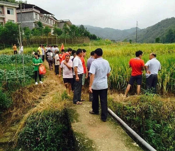上午十點左右,參會人員在王總的帶領下來到赤興鎮(zhèn)雙橋村示范田。遠遠看到的便是如“瀑布”一般的稻穗,吸引著大家圍觀細細察看。首先由亞華種業(yè)蔡經(jīng)理和大家介紹隆兩優(yōu)華占的田間表現(xiàn),通過蔡經(jīng)理的介紹,許多朋友都積極地互動交流起來,紛紛下田查看隆兩優(yōu)華占的生長情況。示范戶鄭師傅高興地和大家交流到:“我種這個品種種了三年,產(chǎn)量年年好,比其他品種高到兩到三百斤,我們村的人種了其他品種不行,也都跟著我都種了隆兩優(yōu)華占。”