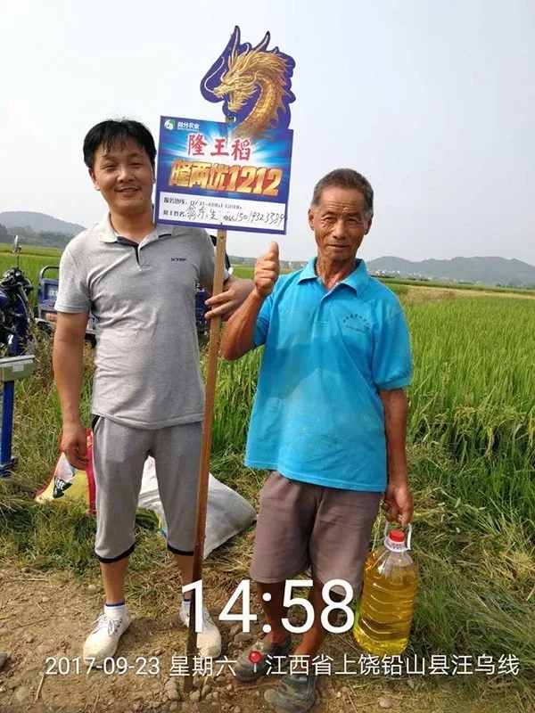 2017年9月23日,隆王稻在上饒市弋陽縣迎來了測產(chǎn)首秀,在弋陽縣代理商朱梅英和姜華老師以及旗山鄉(xiāng)經(jīng)銷商奚天金的組織下,共20位種植大戶見證了隆兩優(yōu)1212當?shù)氐谝淮螌嵉厥崭顪y產(chǎn)大會。