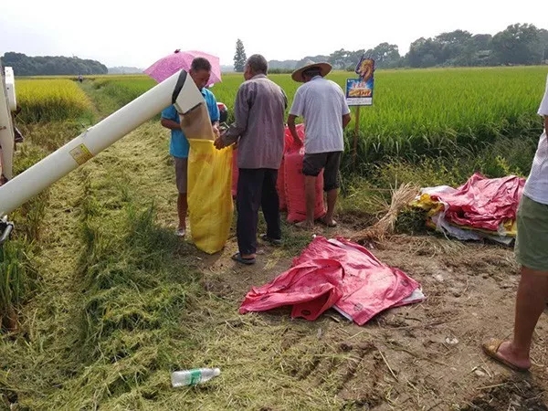 接下來就是收割、測面積、稱重、測產(chǎn)量了。再好看的東西,割不出產(chǎn)量,那都是“花架子”。大戶們觀摩的重點明顯不是田間表現(xiàn)是否漂亮,而是實實在在的產(chǎn)量。測產(chǎn)開始,收割機下田,沒有一會的功夫,5袋谷子出來了,gps測量儀測的收割面積0.3畝,稱重5袋谷子,總重量530.6斤,折合畝產(chǎn)濕谷1768斤,當報出產(chǎn)量1768斤的時候,大家都非常驚訝,米質一流的品種也可以有這么高的產(chǎn)量嗎?最后現(xiàn)場三位估產(chǎn)1700以上的農(nóng)戶還獲得了小禮品。