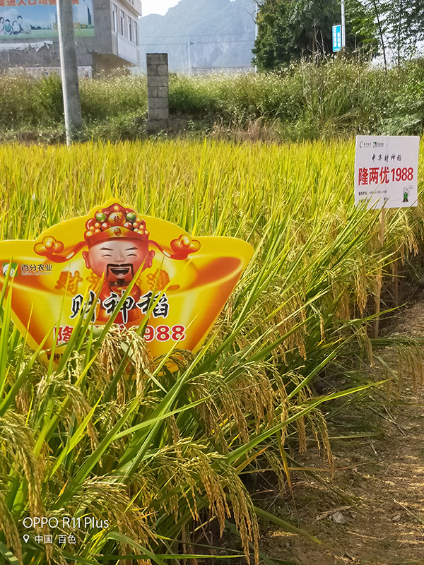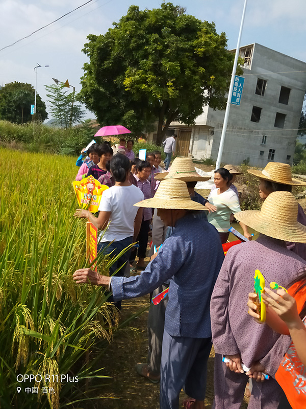 2017年10月27日下午2點,由平果縣代理商黎梅香及零售商黃阿姨共同組織召開隆兩優(yōu)1988的現(xiàn)場觀摩會。剛進入平果縣榜圩鎮(zhèn)上力村頭,車剛停下就有不少熱情的村民過來打招呼。隨后,零售商黃阿姨走巷竄戶通知了還沒有到來的種植能手,很快人潮涌動,笑聲一片。準備工作進行中,給鄉(xiāng)親們派發(fā)了品種單頁、田間插牌、到位人數(shù)簽到等。