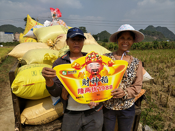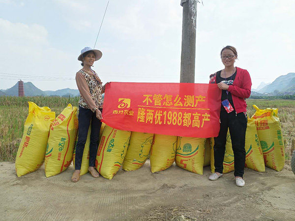 下午收割機(jī)到來(lái),轟隆的氣笛聲中一袋袋谷子入袋,豐收的喜悅再也無(wú)法將臉上的笑容掩蓋,大家紛紛豎起大拇指,這產(chǎn)量就是高啊,隊(duì)長(zhǎng)大聲地問(wèn)到:“隆兩優(yōu)1988種不種?”“種!”洪亮的聲音響滿田間地頭,讓笑容齊飛,迎接豐收。