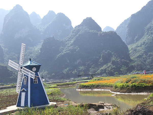 環(huán)山繞水,碧水藍(lán)天下金色的稻穗在風(fēng)中搖曳,在陽(yáng)光中閃爍著別樣的美麗,這里是百色田東縣步兵鎮(zhèn)模范村,新農(nóng)村大改造的生態(tài)度假村。