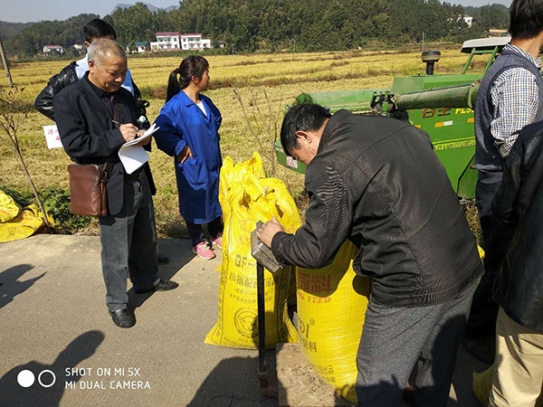 上午10點(diǎn)左右,來自湘潭縣農(nóng)業(yè)局農(nóng)推中心、科教站、植保站、糧油站的領(lǐng)導(dǎo)及湘潭種植大戶、零售商50余人齊聚示范田,一起見證深兩優(yōu)5814再生稻收割的測(cè)產(chǎn)實(shí)況。