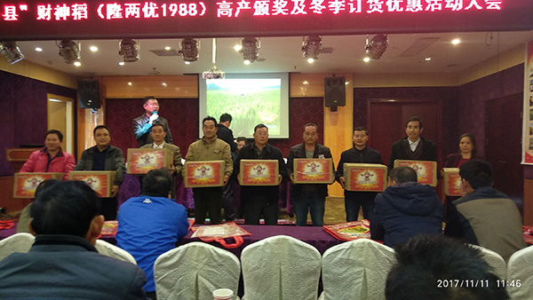 緊接著進(jìn)入激動(dòng)人心的時(shí)刻,財(cái)神稻高產(chǎn)挑戰(zhàn)賽頒獎(jiǎng),經(jīng)過激烈的高產(chǎn)競爭,最終由劉老板等9名種植大戶每人各獲得財(cái)神稻高產(chǎn)挑戰(zhàn)賽高檔電飯煲一臺(tái),看著種植戶滿臉笑容,種財(cái)神稻就對了。最終免費(fèi)坐飛機(jī)游泰國大獎(jiǎng)由流轉(zhuǎn)土地2000畝,2017年財(cái)神稻800畝,平均1600斤/畝,沒有倒伏的譚老板斬獲現(xiàn)場頒獎(jiǎng)結(jié)束,宋總宣布今年財(cái)神稻訂購優(yōu)惠政策,現(xiàn)場預(yù)訂開始,短短20分鐘預(yù)訂10000多斤,最終訂購13000斤。