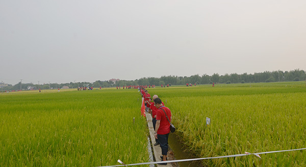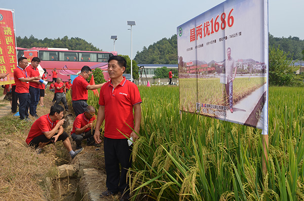 首先,亞華鳳稻——晶兩優(yōu)1686金黃的稻穗映入大家的眼球,穗大粒多、莖稈粗壯、結(jié)實率高等突出表現(xiàn),讓專家們贊不絕口;隨后,絲苗中的翹楚亞兩優(yōu)絲苗如同閃爍著金光吸引了一大批客戶,示范過的經(jīng)銷商們在路邊邊看邊討論,還有經(jīng)銷商自豪地說,“我種的比示范田的好得多”,株高115cm,整精米率更是高達68.6%,絲苗米質(zhì),耐高溫能力強,抗逆性強,不由得讓人感嘆,好品種理應(yīng)如此;然后,大家來到了伴隨陣陣清香如玉般耀眼的振兩優(yōu)玉占示范田,株型緊湊、株高適中、抗倒性強、長寬比超過4、整精米率64.5%,食味評分高達92,種植效益明顯,大家紛紛要求與振兩優(yōu)玉占合影,不愧稱之為“皇族米”;最后,大家來到有著國家“《食味稻品種品質(zhì)》標準一級”稱呼的隆晶優(yōu)4013示范田前,感受著國標一級米品種帶來的震撼,舌尖上的中國可能也不過如此,經(jīng)歷過40天高溫的隆晶優(yōu)4013結(jié)實率絲毫未受到影響,反而逆勢而行,產(chǎn)量可能遠遠超出預(yù)期。經(jīng)過一輪輪震撼觀摩后,大家依依不舍地離開了示范田。