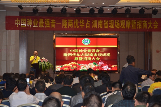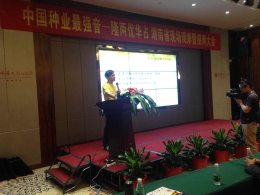 觀摩完畢后,大家乘車(chē)回到酒店會(huì)議室,舉行招商大會(huì)。會(huì)議由湖南亞華種子有限公司營(yíng)銷(xiāo)中心副總何潑主持。首先由亞華公司總經(jīng)理助理張來(lái)友向各位參會(huì)的合伙伙伴致歡迎辭。種植專家副總王小清,對(duì)全國(guó)各地的種植表現(xiàn)以及隆兩優(yōu)華占的特征特性,進(jìn)行了生動(dòng)詳實(shí)的介紹。