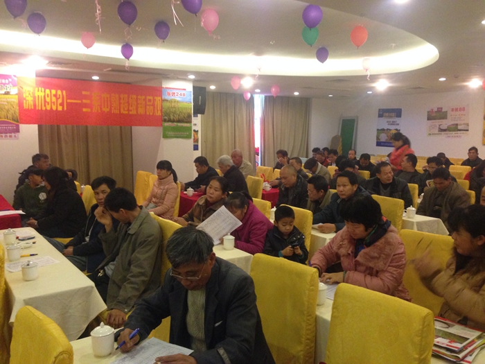 與會的亞華種子廣東分公司副總經(jīng)理曹攀峰對今年早造市場形勢進行分析,并帶來了公司強勢的早造新品種——深優(yōu)9521﹙粵審稻2013038﹚。該品種為感溫型三系雜交稻組合,早造平均全生育期在懷集大約為125—128天,科高100厘米左右,株形適中,分蘗力較強,結實率高,米質鑒定為國標優(yōu)質2級和廣東省標優(yōu)質3級,生長清秀,后期熟色好,抗倒力強,中抗白葉枯病??梢哉f是廣大零售商們非常歡迎的早造品種。大家聽了曹經(jīng)理的介紹,又通過視頻和照片觀看了廣東各縣深優(yōu)9521的表現(xiàn)情況,喜出望外,紛紛表示“大品牌好品種,值得信賴”,“今年早造又有好品種賣了”,“這好品種我要主推”……