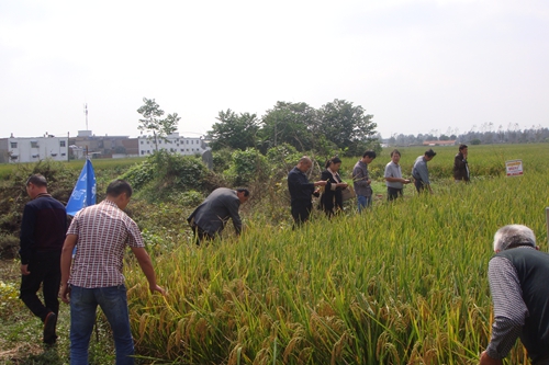 安徽穎上縣代理商田老板對遠道而來參觀的河南客人說:“這個品種我仔細觀察了二年,它高抗、高產(chǎn)、優(yōu)質(zhì)、抗倒,竟沒有看到任何缺點,歡迎大家來找隆兩優(yōu)華占的不足之處,如發(fā)現(xiàn)有紅包獎勵!”,大家都紛紛下到田里,仔細查起來,經(jīng)過一番觀摩,大家一致認可隆兩優(yōu)華占的優(yōu)異表現(xiàn)。經(jīng)銷商朋友們在田間手捧黃燦燦、沉甸甸的稻谷,滿意的微笑充溢臉上,情不自禁的采摘,以帶回門店展示。相信隆兩優(yōu)華占龍旗將遍布河南固始縣的鄉(xiāng)鎮(zhèn),為百姓帶來豐收、創(chuàng)造更好的經(jīng)濟效益!