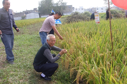 2014年9月30日,河南省固始縣10多位優(yōu)秀的種子經(jīng)銷商驅(qū)車400多里遠赴安徽省穎上縣,對湖南亞華種子有限公司的中國種業(yè)最強音—隆兩優(yōu)華占進行了田間觀摩、考查。該田塊5月4日育秧,6月10日移栽,栽插規(guī)格7寸×9寸,畝施肥僅40公斤含量50%的BB肥,全年打2次殺蟲的藥,純粹的農(nóng)戶粗放管理,但隆兩優(yōu)華占的表現(xiàn)確實讓到會的朋友們驚奇:長勢茂盛、清爽、沒有一點病害,莖桿粗壯、韌性好、無任何倒伏跡象,分蘗力強、多的有30根分蘗,穗大粒多、主穗長32厘米、著粒緊密達500粒,結(jié)實率高達86.5%、產(chǎn)量1400斤以上。
