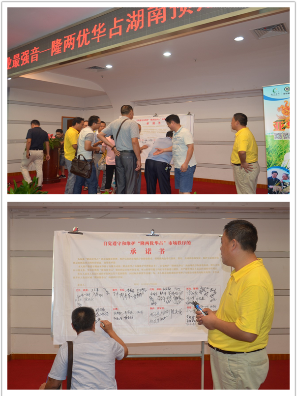 寧鄉(xiāng)歐總、汨羅喻總、祁陽(yáng)曹總、洞口劉總、漢壽周總等經(jīng)銷(xiāo)商代表也紛紛上臺(tái)作出講話,首先他們都高度贊揚(yáng)了隆兩優(yōu)華占表現(xiàn)出的高產(chǎn)、抗病、抗倒、再生力強(qiáng)、米質(zhì)優(yōu)等優(yōu)秀品質(zhì),并且一致認(rèn)同亞華種業(yè)這次在預(yù)定方式上做的改革。在市場(chǎng)規(guī)范方面,經(jīng)銷(xiāo)商們都積極、主動(dòng)、自發(fā)地簽署了“隆兩優(yōu)華占市場(chǎng)秩序維護(hù)承諾書(shū)”,并且表示從大局來(lái)看,這是人人都必須遵守的規(guī)則,是實(shí)現(xiàn)共贏的堅(jiān)實(shí)基礎(chǔ)。