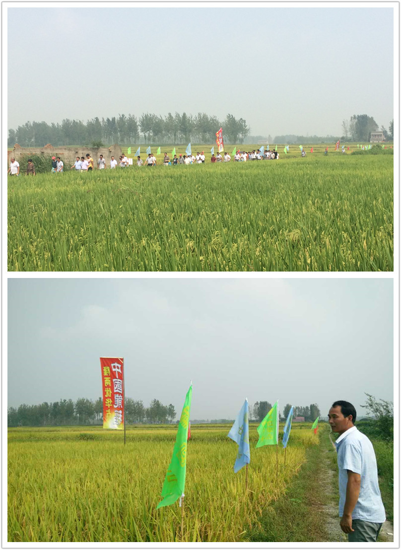 2015年8月29日,在霍邱縣宋店鄉(xiāng)的一片稻田中,166位零售商和種田大戶參加中國最強音—隆兩優(yōu)華占現(xiàn)場觀摩會,印有“中國龍稻 隆兩優(yōu)華占”字樣的超大旗幟在微風(fēng)中飄揚。一大群人圍繞著稻田,有的數(shù)分蘗,有的數(shù)稻粒,有的查看是否有空殼或病蟲害,他們查看后紛紛豎起大拇指,稱贊隆兩優(yōu)華占真心不錯!