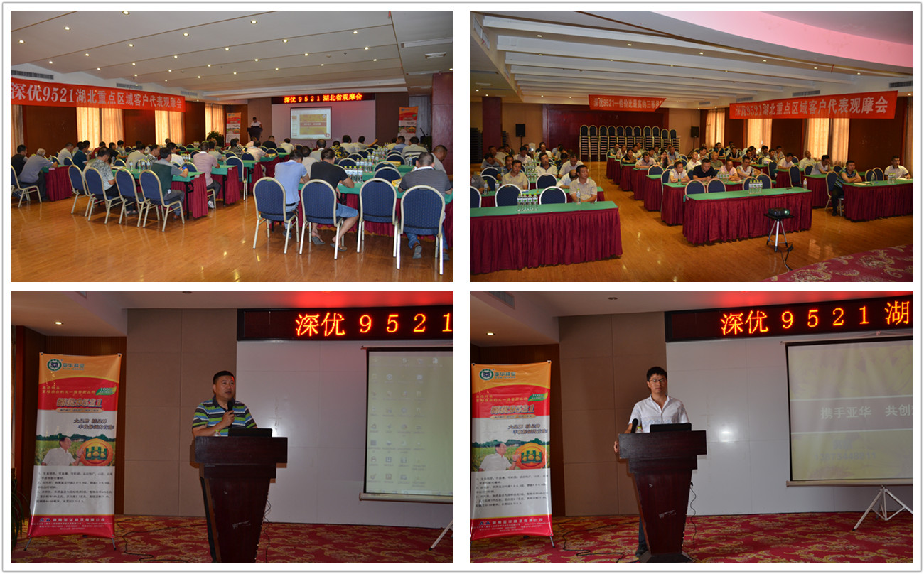 會議上,首先由客戶代表講解深優(yōu)9521的大田表現(xiàn):“深優(yōu)9521的分蘗比較好,畝有效穗多;抗倒強(qiáng)直播、機(jī)插、移栽都適合;抗性也不錯,田間沒有稻瘟病發(fā)生。”天門的吳總說到:“深優(yōu)9521容易種,又好管理,產(chǎn)量穩(wěn)定,特別適合種田大戶種植”。隨后,亞華種業(yè)區(qū)域經(jīng)理黃凱對公司做了簡介,還介紹了深優(yōu)9521品種的高產(chǎn)穩(wěn)產(chǎn)、分蘗強(qiáng)、米質(zhì)優(yōu)、抗倒強(qiáng)、多樣種植模式等優(yōu)勢,并展示了公司的一些后續(xù)優(yōu)勢新品種。最后,湖北分公司總經(jīng)理姜文嘉發(fā)表了深優(yōu)9521的市場運(yùn)營模式和種業(yè)現(xiàn)狀,提醒大家把握機(jī)遇,抓住商機(jī)做一個優(yōu)秀的種業(yè)人。