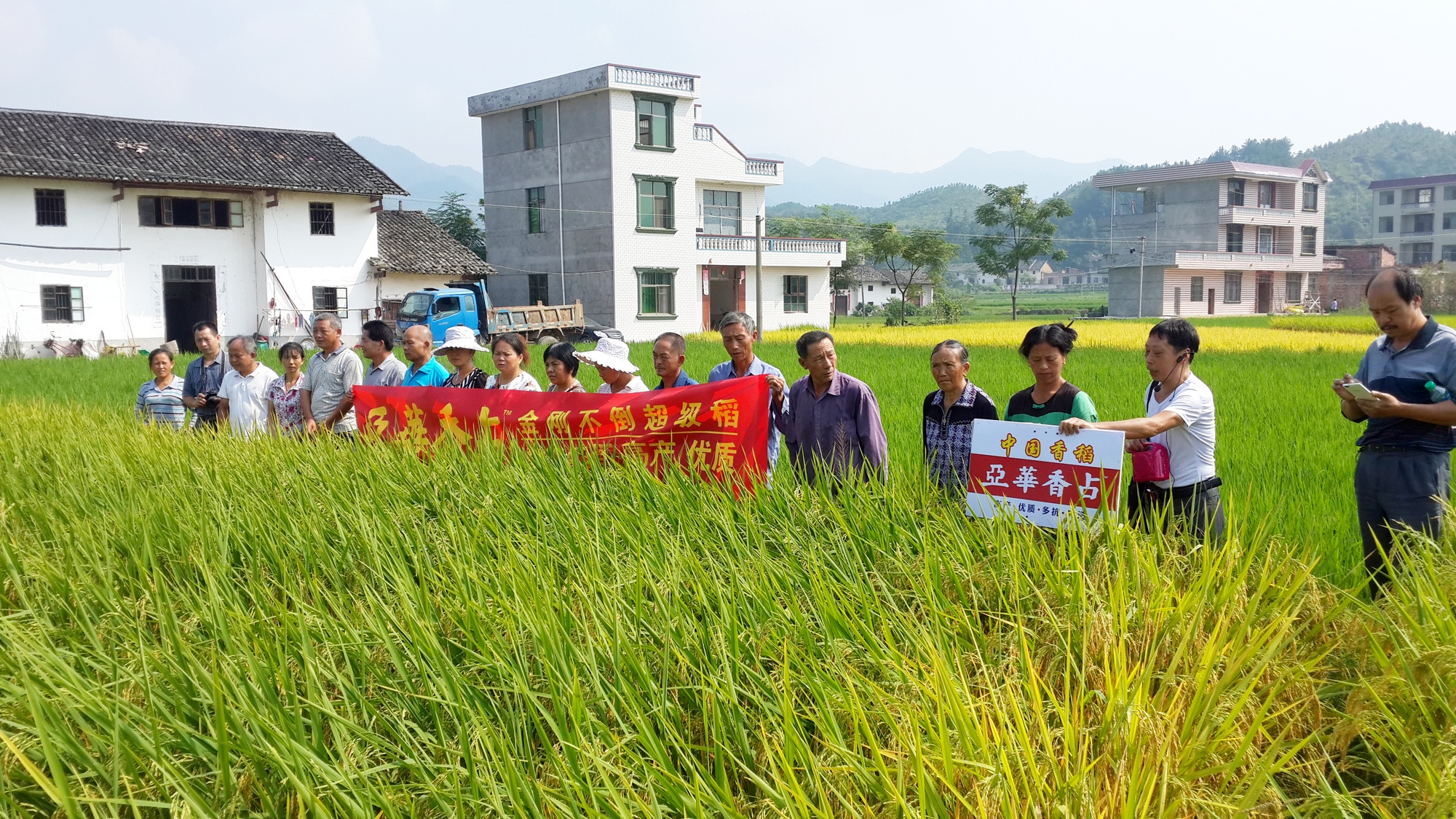 2015年9月10日上午,一輛小巴車從遂川縣亞華專賣店門口開往草林鎮(zhèn)。由亞華代理商曾昭華召集了各個鄉(xiāng)鎮(zhèn)的零售商一起去示范田觀摩金剛不倒鐵桿超級稻——亞華香占。