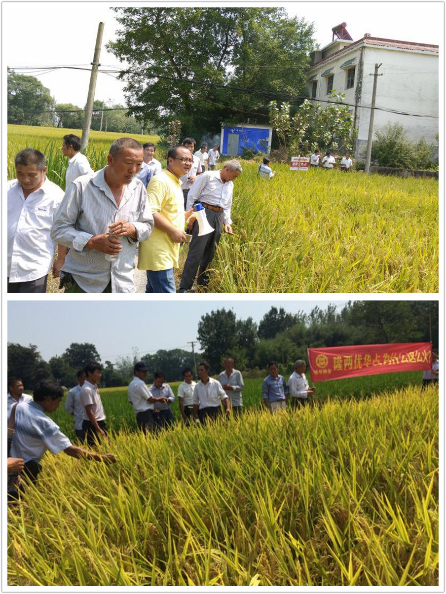 大家在吳總的引導下來到田邊:“今天請大家來看看我們今年銷售的、種田大戶種的隆兩優(yōu)華占表現(xiàn)到底怎么樣,首先告訴大家一個好消息,我們這個好品種隆兩優(yōu)華占已經通過國家審定了,有了自己的身份證,審定編號:2015026,不僅僅如此,隆兩優(yōu)華占將通過全國四大稻區(qū)的審定,一個品種能通過全國四大稻區(qū)的審定,在國內也找不出來啊,這說明什么?說明隆兩優(yōu)華占,1、適應性廣2、抗性好,稻瘟病抗性綜合指數(shù)2.2,這樣的抗性不錯?。?、抗高溫、耐低溫,2013年的高溫年份、2014年的低溫年份對隆兩優(yōu)華占的結實率沒有影響,結實率都達到了90%以上4、產量高、米質屬于國家標準一級米啊,不吃菜都能吃三碗米飯??!5、抗倒伏,是袁隆平院士贊譽的‘金剛不倒鐵桿超級稻’”。