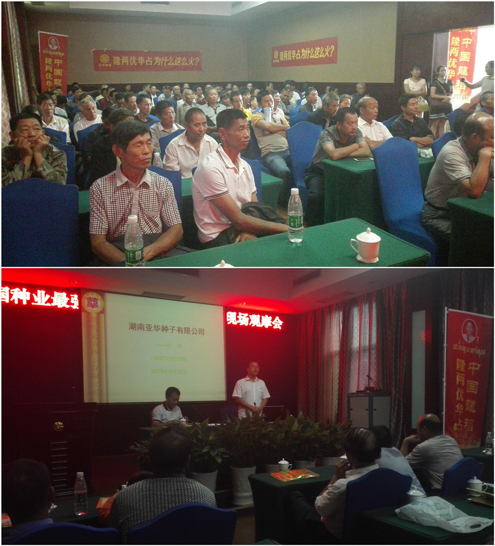 觀摩結(jié)束后,室內(nèi)會議在澧縣桃花灘賓館召開,會上,種植戶代表胡定文分享了種植隆兩優(yōu)華占的經(jīng)驗(yàn),小渡口經(jīng)銷商劉老板就隆兩優(yōu)華占的特征、特性及適合當(dāng)?shù)氐挠梅N量、栽培管理方式進(jìn)行了分析講解。亞華種業(yè)大區(qū)經(jīng)理劉松就公司發(fā)展及品種的運(yùn)作、市場管理等方面和大家進(jìn)行了講解。最后由澧縣代理商將隆兩優(yōu)華占的預(yù)定優(yōu)惠政策進(jìn)行了解讀,讓農(nóng)戶們能夠種上好品種、獲得好收成!