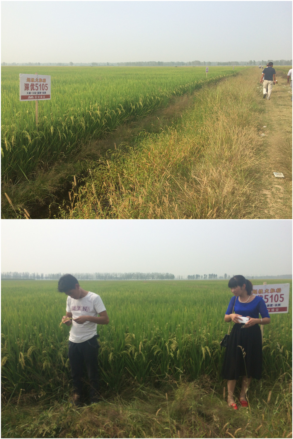 示范田是代理商自己的,面積有40多畝,全部是撒播。參會的零售商仔細(xì)地查看了品種的長勢、病蟲害等情況。大家都被品種清秀的長相、飽滿的谷粒、旺盛的分蘗力深深的折服。來自汪集的零售商付中立說他今年也弄了幾畝深優(yōu)5105的直播稻,表現(xiàn)比這個(gè)漂亮多了,明年他要把自己家的30畝田全部種上這個(gè)品種。