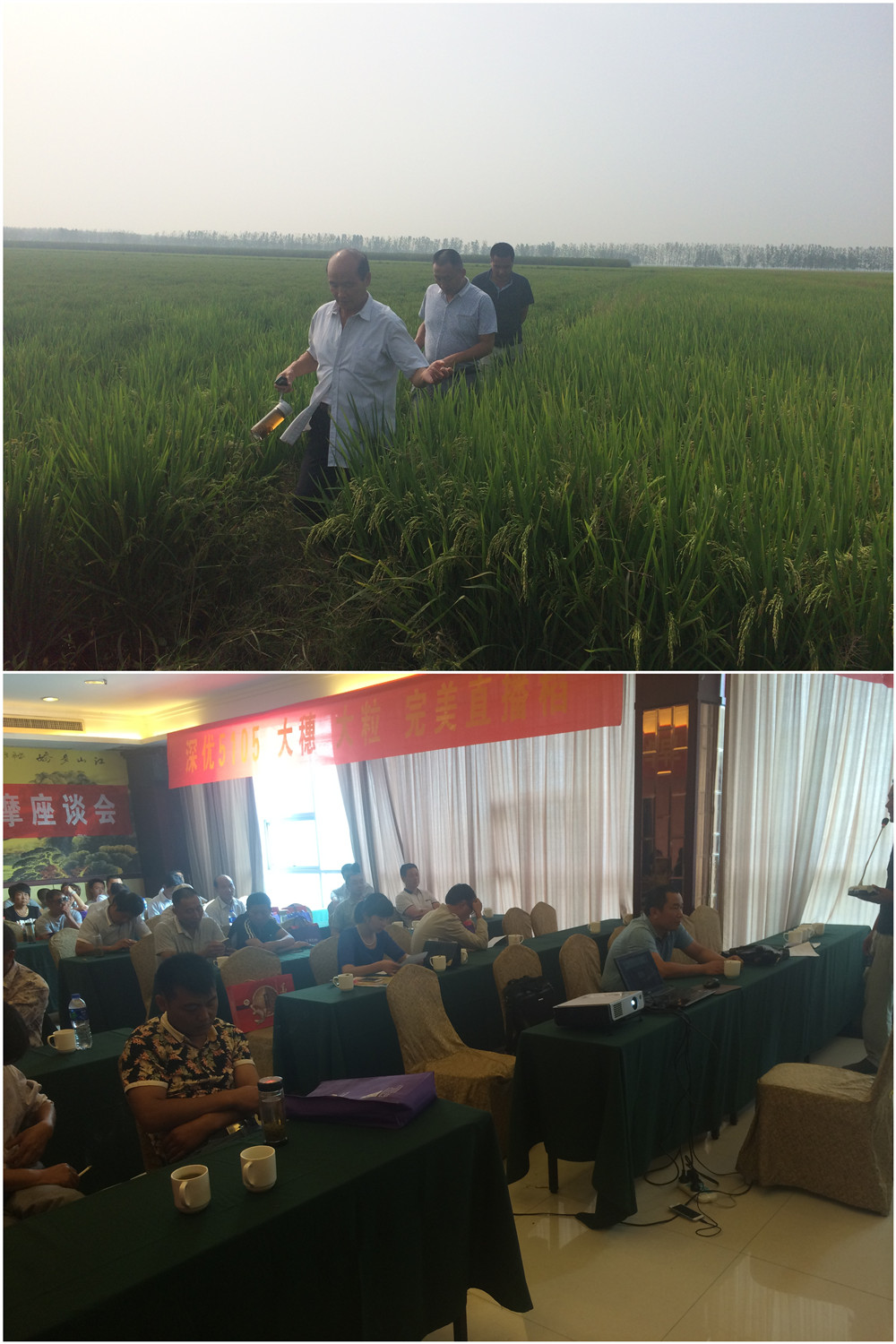 室內(nèi)會議代理商向大家介紹了他種植深優(yōu)5105的一些情況:“今年在苗期遇上大水,示范田被淹了半個(gè)月,肥料都被水帶走了。后期因?yàn)槊τ谏鉀]有顧得上管理,一直處于干旱狀態(tài),品種的大穗性狀沒有凸顯出來。因?yàn)槿ツ晖茝V面積小,長得好的幾個(gè)田塊路途比較遠(yuǎn),才選了這里作為現(xiàn)場”。通過示范,他認(rèn)為深優(yōu)5105是一個(gè)大穗大粒、分蘗力強(qiáng)、耐肥抗倒的優(yōu)良直播稻品種。如果采用旱播水管的種植模式更能突顯品種的優(yōu)良特性,他相信深優(yōu)5105將成為當(dāng)?shù)刂辈サ局械耐跖破贩N!