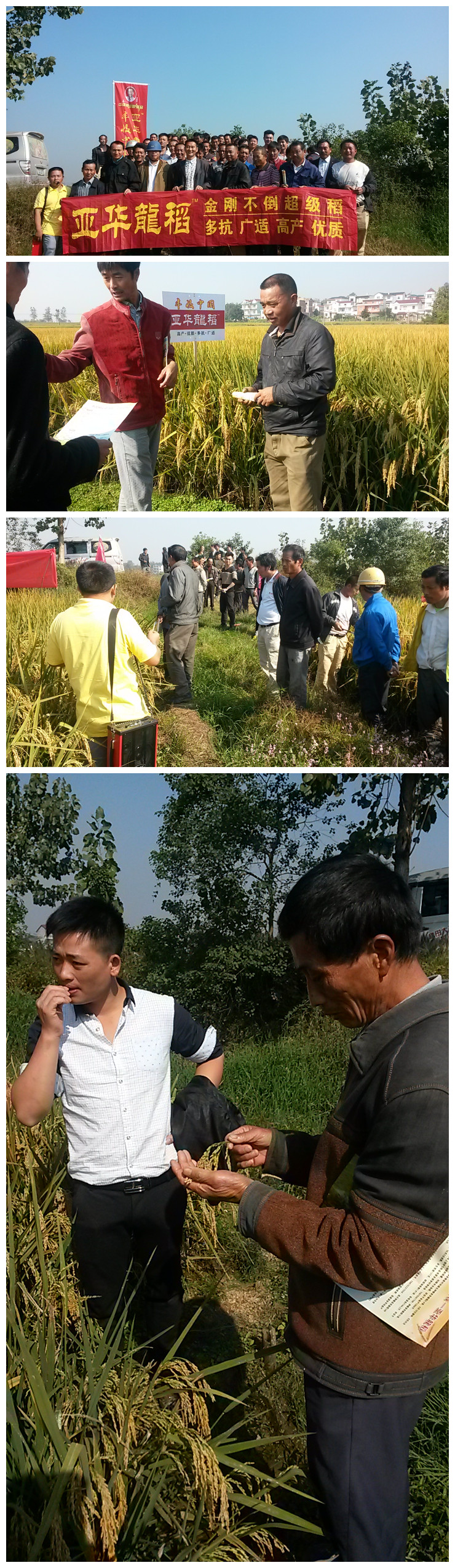 2015年10月15號(hào),在江西萬(wàn)年縣湖云鄉(xiāng)白馬村,迎面而來(lái)的是彩旗飄飄、稻浪滾滾的示范田,就在這番美景之中順利召開(kāi)了亞華龍稻現(xiàn)場(chǎng)觀摩會(huì)。人們不由自主地下到田邊、田中去近距離地觀看和親近這美景。人們仔細(xì)地觀看后說(shuō):“這品種結(jié)實(shí)率真高!到穗頸處的谷粒都是個(gè)個(gè)飽滿”“亞華龍稻的發(fā)蔸能力真強(qiáng),平均有15根,按照這田間表現(xiàn)收割定是大豐收”!