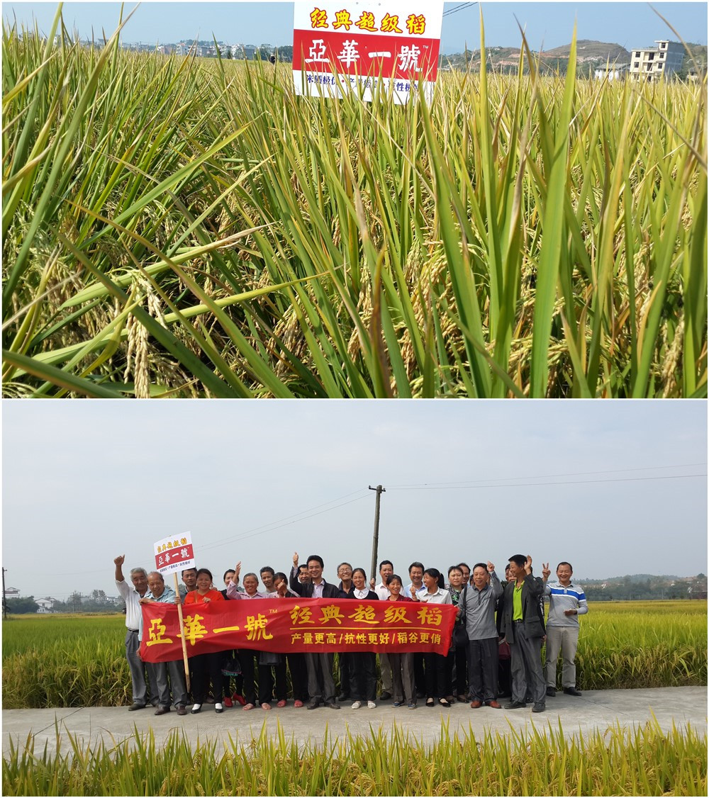 大家在縣城集合,9點30踏上了亞華一號觀摩會之旅,抵達亞華一號的觀摩田,首先映入大家眼簾的就是又大又長的穗子,金黃色沉甸甸的谷子隨風在空中搖曳,看相非常之好!大家不約而同地下到田間,近距離接觸亞華一號。據(jù)亞華種業(yè)的講解員介紹,亞華一號有以下特點:株型緊湊、莖稈粗壯、抗倒力強、生長勢強、繁茂性好、葉鞘綠色、劍葉直挺、抽穗整齊、分蘗力強、成穗率高、結實率高等。高產栽培畝產可達800公斤以上,而且米質優(yōu),適口性很好。只見眾零售商不時地拿起穗子仔細觀摩:“穗子這么長、這么密、產量了不得”,更有一位零售商采摘了不少穗子,說要帶回去給別人一起推薦、分享亞華一號這個好品種。