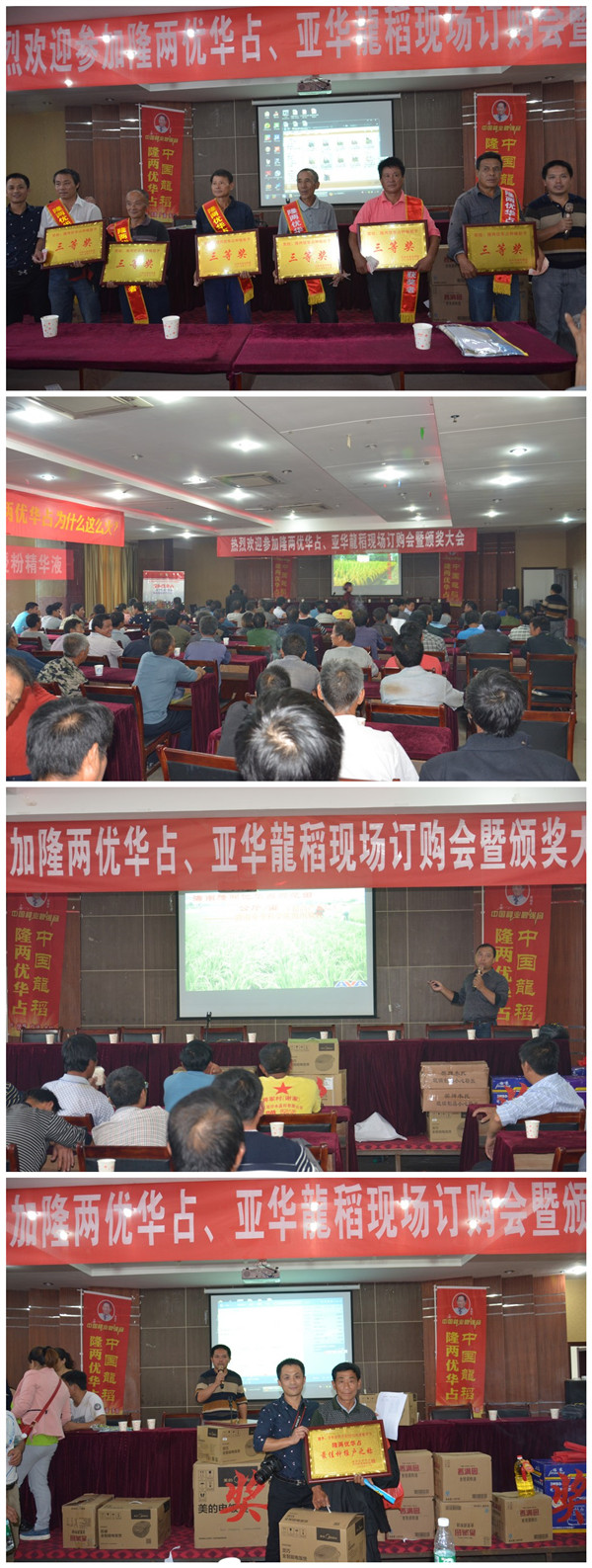 下午的室內(nèi)會議上,首先由三位淳樸的種植戶分享了通過種植隆兩優(yōu)華占喜獲豐收的故事,喜悅之情溢于言表,看得出句句都是肺腑之言, 他們都由衷地感謝亞華種子有限公司能夠提供這樣的良種,并表示選擇隆兩優(yōu)華占就是選擇了豐收和財富。緊接著由亞華種業(yè)江西分公司總經(jīng)理谷恩華就隆兩優(yōu)華占在市場上火爆銷售的情況作了分析:產(chǎn)量高、抗性強、米質(zhì)優(yōu)、種植戶喜愛;江西各地高產(chǎn)典型事例——2014年弋陽李萬良實收濕谷2144斤/畝,2014年樂平市農(nóng)業(yè)局二晚驗收平均1852斤/畝,2015年臨川市榮山鎮(zhèn)王仕高(13755955705)實收干谷1657斤/畝等;高產(chǎn)栽培的種植技術(shù)探討;品種的運作模式——不定種、不供種,進行了深度地分享。在隆兩優(yōu)華占銷售如此緊俏的浪潮里,選擇預(yù)定隆兩優(yōu)華占就是選擇了財富。隨即農(nóng)戶紛紛交定金開始了明年種的預(yù)定,因為沒人想錯過來年的豐收,最終實收六位數(shù)的預(yù)定款。