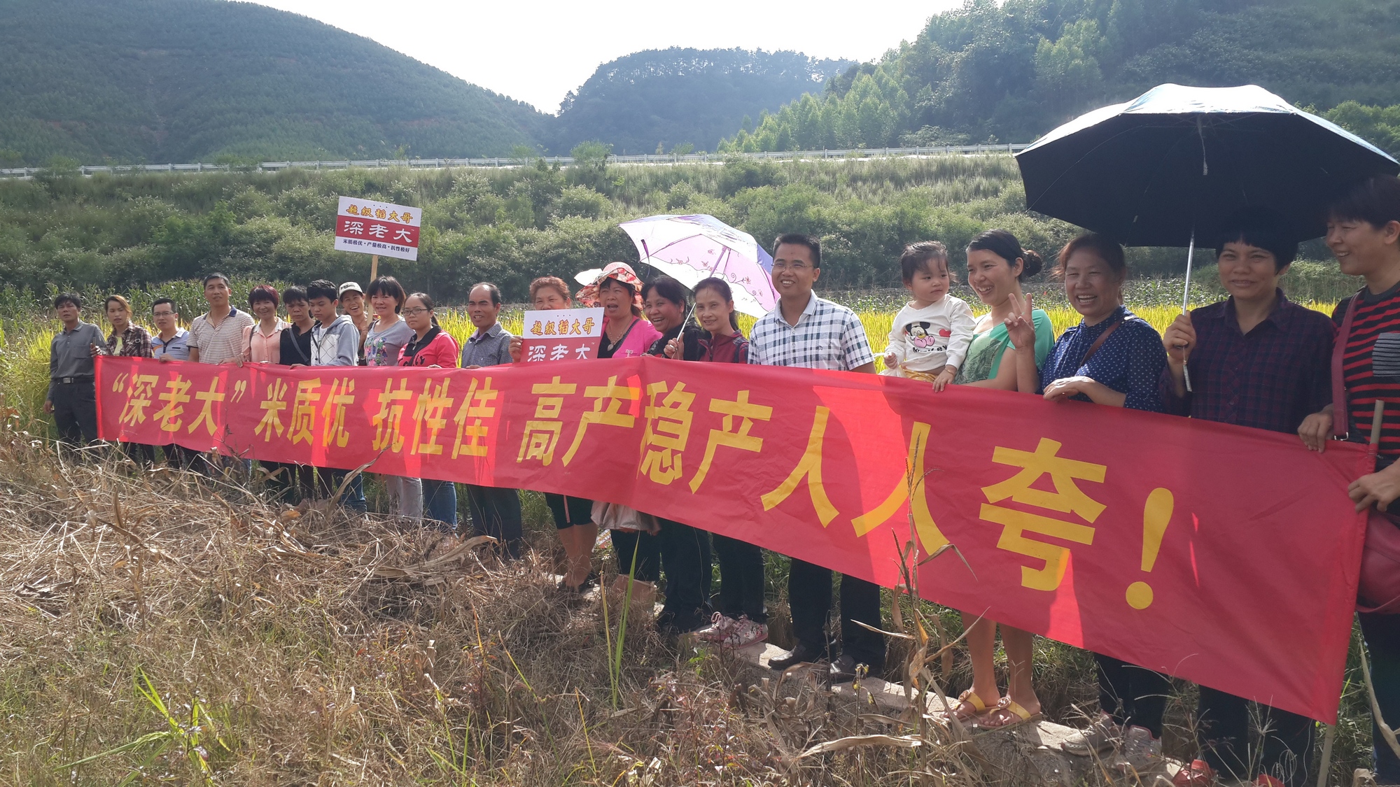 早上八點(diǎn),全部的零售商及工作人員聚集在代理商的門(mén)市部,等待出發(fā)前往田間會(huì)場(chǎng)。伴隨車隊(duì)集結(jié)完畢,汽車緩緩前行,我們的田間觀摩之旅開(kāi)始了。6部汽車在美麗的山間公路結(jié)伴前行,一路的風(fēng)景美如畫(huà),經(jīng)過(guò)一個(gè)小時(shí)的行程,我們到達(dá)了此次田間的會(huì)場(chǎng)。一下車就看到了紅色的條幅以及金黃色的稻谷,放眼望去,在朝陽(yáng)的照射下,紅色的條幅、插牌、金色的稻谷以及邊上綠色的芭蕉葉,組成了一幅美麗的圖畫(huà)。我們走下汽車,零售商們紛紛走進(jìn)田間,仔細(xì)地觀察田間的品種,有的拉著稻穗看著稻穗的長(zhǎng)度和數(shù)著粒數(shù),有的扒開(kāi)稻株觀察病蟲(chóng)害情況,有的忙著與稻谷合影,有的在田間來(lái)回走動(dòng),拿隆兩優(yōu)華占與邊上的深老大和野香優(yōu)703做對(duì)比。今年晚稻整個(gè)廣西雨季偏多,很多品種得病很嚴(yán)重,特別是稻曲病最為嚴(yán)重,但我們的兩個(gè)品種在這邊表現(xiàn)干干凈凈,而且稻瘟病、紋枯病也很少,比旁邊的其他品種表現(xiàn)好很多。大家都稱贊這兩個(gè)品種抗性真的很好。有位零售商折下一根隆兩優(yōu)華占稻穗對(duì)我說(shuō);:“這個(gè)品種我跟蹤兩年了,他的抗性和米質(zhì)都是很好的,而且你看這個(gè)稻穗,穗子長(zhǎng)、粒數(shù)多、結(jié)實(shí)率很高,這塊田的產(chǎn)量應(yīng)該很高的。我現(xiàn)在著急等待你們審定早點(diǎn)通過(guò)呀。”在田間會(huì)場(chǎng),平果代理商簡(jiǎn)單介紹隆兩優(yōu)華占及深老大的特性,以及她自己前段時(shí)間在玉林參加觀摩會(huì)看到別的地方的表現(xiàn),她很堅(jiān)定地跟客戶們說(shuō)隆兩優(yōu)華占在平果絕對(duì)有很大的前途和錢(qián)途,并對(duì)明年各個(gè)鄉(xiāng)鎮(zhèn)的示范計(jì)劃做安排。