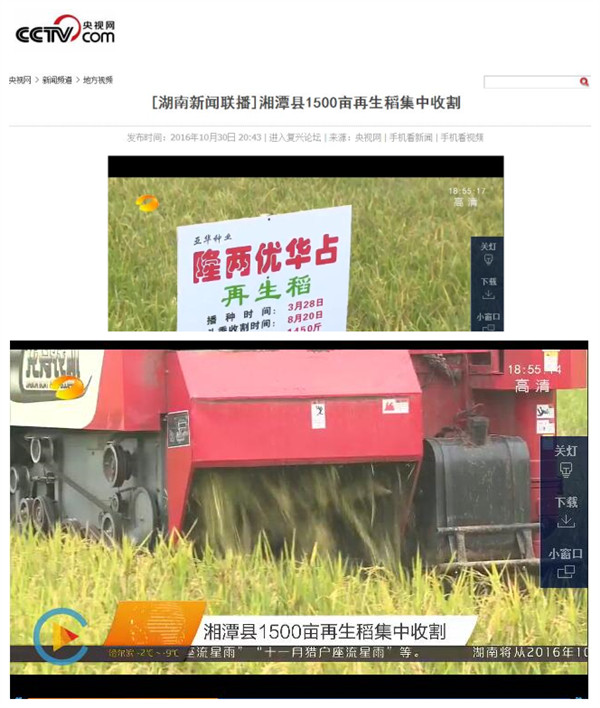 湘潭縣種植大戶馬新泉在白石鎮(zhèn)種植再生稻1500余畝,總共選取了7個品種進行對比試驗,通過兩年來的跟蹤及數(shù)據(jù)收集,隆兩優(yōu)華占的綜合表現(xiàn)最為突出,頭季產(chǎn)量達到1500斤/畝左右。 2016年10月30日,湘潭市電視臺對隆兩優(yōu)華占再生稻測產(chǎn)進行現(xiàn)場采訪報道,產(chǎn)量在400-700斤/畝之間。CCTV,湖南衛(wèi)視等相關(guān)媒體對此做了跟蹤報道,視頻請鏈接http://news.cctv.com/2016/10/30/VIDEPxcz7tMtH2wQk56wLy9G161030.shtml