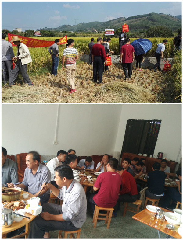 早上八點,全體人員集結(jié)完畢,6部汽車帶著我們向石羅前進(jìn)。汽車在美麗的鄉(xiāng)間公路前行,一路的風(fēng)景美如畫,經(jīng)過一個小時的行程,我們到達(dá)了此次田間的會場。我們向著隆兩優(yōu)華占田塊前行,零售商們紛紛走進(jìn)田間,仔細(xì)地觀察隆兩優(yōu)華占田間的表現(xiàn),有的拉著稻穗,看稻穗的長度并數(shù)粒數(shù),有的扒開稻株觀察病蟲害情況,有的忙著與稻谷合影,有的在田間來回走動,拿隆兩優(yōu)華占與旁邊的其他品種做對比。今年晚稻整個廣西雨季偏多,很多品種得病很嚴(yán)重,特別是稻曲病最為嚴(yán)重,但隆兩優(yōu)華占這邊表現(xiàn)干干凈凈,比旁邊的其他品種表現(xiàn)好很多。大家都稱贊這個品種抗性真的很好。有位零售商跟我說:這個隆兩優(yōu)華占相對其他品種,最大的優(yōu)勢是豐產(chǎn)性和抗性,我做了三年示范了,年年表現(xiàn)很好。在田間會場,貴港代理商簡單介紹隆兩優(yōu)華品種特性,以及他經(jīng)過這三年的跟蹤觀察的感受和了解,他認(rèn)為如果目前市場上大力推廣的晶兩優(yōu)和隆兩優(yōu)系列是桂楠晚稻的明星品種,那么隆兩優(yōu)華占就是這兩個系列品種里最耀眼的明星。