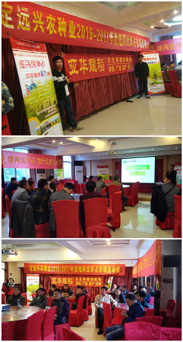 2016年9月30日,在安徽省定遠縣,興農種業(yè)組織隆重召開了定遠縣2016~2017年度隆兩優(yōu)華占市場啟動會。當日秋雨連綿不斷,寒風吹動旗角,聲聲作響,將“隆兩優(yōu)華占”一列列金字抖得威風凜凜,霸氣十足。