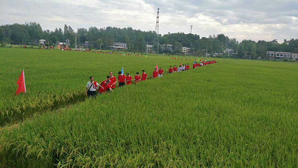 早上8點(diǎn),微風(fēng)吹拂,霞光萬(wàn)道,全體與會(huì)人員精神抖擻,來(lái)到隨州何店鎮(zhèn)示范田間觀摩,示范田分水直播和旱直播兩種模式。此次田間觀摩的主要目的是通過(guò)高密度直播檢驗(yàn)其豐產(chǎn)性、抗倒伏性、抗病性、分蘗力、結(jié)實(shí)率以及不同的栽培模式表現(xiàn)優(yōu)勢(shì)等。通過(guò)現(xiàn)場(chǎng)觀摩及與示范專家王保民和當(dāng)?shù)剞r(nóng)業(yè)主管部門的技術(shù)專家交流得知:隆兩優(yōu)華占在隨州上市3年來(lái),經(jīng)歷了2016年的“水深火熱”及2017年的長(zhǎng)期高溫考驗(yàn),仍舊表現(xiàn)出抗病、高產(chǎn)、分蘗力強(qiáng)、米質(zhì)好、商品性優(yōu)異、結(jié)實(shí)率高等優(yōu)勢(shì),經(jīng)試驗(yàn)還適合機(jī)插、移栽、直播、拋秧等多種栽培模式。其“四國(guó)審,秈稻區(qū)域全覆蓋”、“農(nóng)業(yè)部超級(jí)稻”、“全球水稻年度明星品種”等榮譽(yù)實(shí)至名歸?,F(xiàn)場(chǎng)嘉賓嘖嘖稱贊:結(jié)實(shí)率高達(dá)86%,沒(méi)有紋枯病、沒(méi)有稻瘟病、沒(méi)有卷葉螟、清秀挺拔,實(shí)在是百年不遇的好品種。同時(shí)壟上頻道全程航拍、《隨州社會(huì)全方位》欄目及《農(nóng)村新報(bào)》在現(xiàn)場(chǎng)采訪荊州、孝感和荊門的客戶將田間觀摩活動(dòng)推向了高潮。