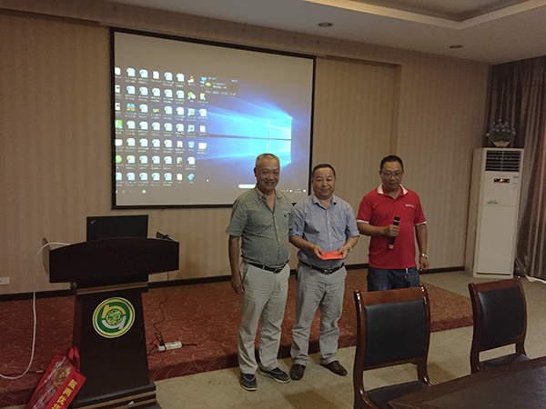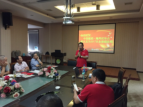 在室內(nèi)會議中,首先由亞華種業(yè)湖北分公司李小軍經(jīng)理對隆兩優(yōu)華占的一系列傳奇故事進行了回顧,并對隆兩優(yōu)華占在2017年獲得的“水稻明星育種品種”、“2017年農(nóng)業(yè)部超級稻”、“榮登四國審寶座”等榮譽進行介紹。