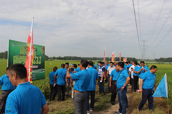 會(huì)議伊始,在定遠(yuǎn)縣隆兩優(yōu)1212代理商郭海濤的組織下,全體參會(huì)人員乘車前往定遠(yuǎn)縣桑澗鎮(zhèn)觀摩隆兩優(yōu)1212的示范田。由朱經(jīng)理向大家介紹了隆兩優(yōu)1212示范田的播種、移栽、齊穗時(shí)期和施肥等情況,也得到了經(jīng)銷商們的一致好評(píng)。