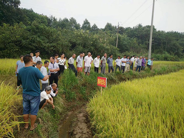 2017年8月27日,來自王家橋鎮(zhèn)的30余名農(nóng)戶來到關(guān)洲村8組的田間進行隆兩優(yōu)華占現(xiàn)場觀摩。其中,有不少農(nóng)戶是具有多年種植經(jīng)驗的老農(nóng),品種好不好,他們有自己的種植經(jīng)驗,看分蘗、看空癟粒、看株葉形態(tài),就能了解得差不多。甚至有農(nóng)戶直接脫下鞋,赤腳踩進田中,隨機選取幾蔸,數(shù)有效穗,又隨機取幾穗,拿到田埂上仔細地數(shù)了數(shù)總粒數(shù)及空憋粒,然后豎起大拇指,興奮地說到:“這個品種分蘗力強,結(jié)實率高,明年就種它了!”