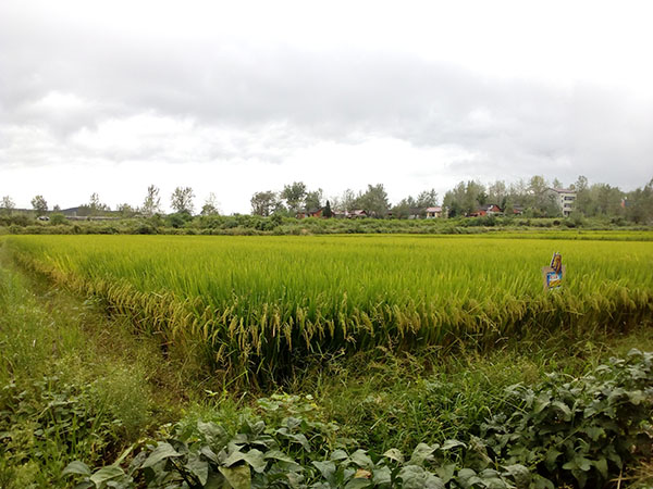 8點(diǎn)半左右在聶老板帶領(lǐng)下,大家來(lái)到萬(wàn)店示范田塊觀摩。葉青籽黃是大家看到示范田塊的第一印象!該示范田播種在四月中下旬,全程高溫抽穗、揚(yáng)花,結(jié)實(shí)率可達(dá)90%,田間清秀、株型挺拔、緊湊。