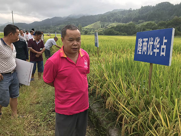 2017年8月30日上午,新晃縣亞華種業(yè)代理商吳克云在扶羅鎮(zhèn)組織了隆兩優(yōu)華占觀摩會(huì),前來觀摩的有農(nóng)業(yè)局領(lǐng)導(dǎo)、亞華種業(yè)婁懷區(qū)域經(jīng)理何少海、鄉(xiāng)鎮(zhèn)種子零售商及種田大戶。當(dāng)日烏云密布,但絲毫沒有影響大家的熱情。看著插有隆兩優(yōu)華占示范牌的田塊,所有人的目光都被它又長(zhǎng)又多的穗子吸引,種植戶得意地說,“從來沒有種過產(chǎn)量這么高的,今年是選對(duì)種了,這2畝田少說要收3000斤谷”。