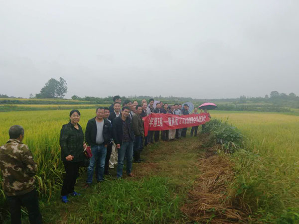 2017年9月3日,天空飄著毛毛細(xì)雨,一個(gè)傳世佳作——隆王稻(隆兩優(yōu)1212)在美麗的京山縣曹武鎮(zhèn)的向30多位經(jīng)銷商和農(nóng)戶展現(xiàn)它神秘的容顏。