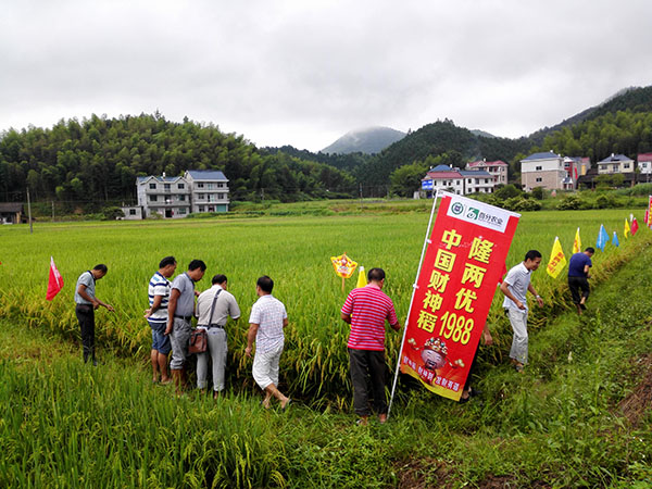 2017年9月11日上午,呼吸著雨后清新的空氣,德興市繞二鎮(zhèn)江灣村,一塊彩旗飄飄的田埂上人來人往,好不熱鬧,究其因,原來是財神稻又在展現(xiàn)她的傲人風采。