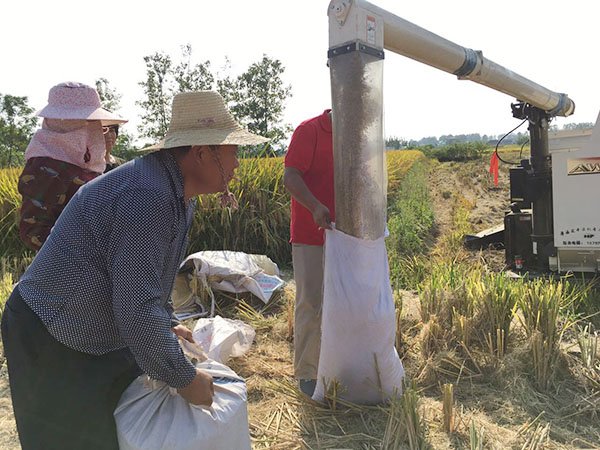下午3時許,測產(chǎn)會正式開始,轟鳴的收割機動力十足,好像迫不及待的要將財神稻裝進自己的“背包”里,收割正在進行中,這時走過來一位年長的老爺爺,他也是聞訊趕來,想一睹財神稻的風采,望著田里還未收割的稻谷,老爺爺興奮地說:“這個稻谷長得好啊,明年可以留作稻種。”周圍的農(nóng)戶們都笑了,這雖然是一句“外行”話,但反映出我們財神稻在當?shù)氐膬?yōu)良表現(xiàn)得到了廣大農(nóng)戶的認可。收割完后,觀摩的農(nóng)戶們紛紛上前幫忙裝袋、稱重、測面積,著急想知道最終的產(chǎn)量結(jié)果。稱重完畢,計算結(jié)束,揭曉最終結(jié)果:正好一畝(667m2)面積共產(chǎn)26大袋,計2002斤,扣除12%水分,畝產(chǎn)干谷1760斤,種植戶梁昌貴得知這個產(chǎn)量十分激動,該種植戶今年共種植財神稻20余畝,看到這個產(chǎn)量,當場表示明年要種更多,同時觀摩的農(nóng)戶也對財神稻的產(chǎn)量大加贊賞。