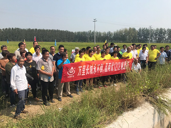 其中有一位種植戶說:“這塊田保守估計(jì)畝產(chǎn)1700斤應(yīng)該沒有問題”。大家看過之后都表示明年要賣這個(gè)品種。晶兩優(yōu)1212分蘗超強(qiáng)、抗病抗倒強(qiáng),最主要是米質(zhì)還好,老百姓種了肯定效益好。最后大家積極踴躍地和美田合影留念。